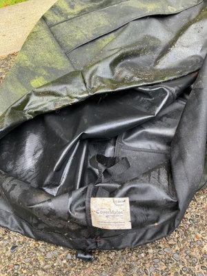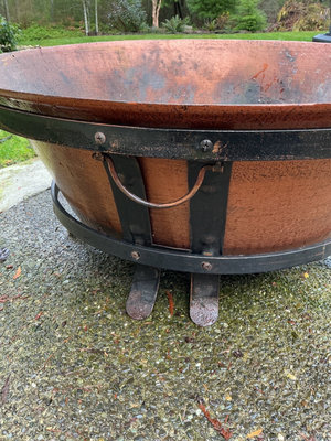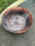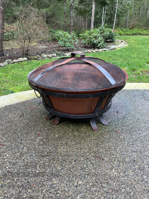 A round copper colored metal outdoor fire pit with a mesh lid, metal bands, and a wire insert inside, accompanied by a black weatherproof outdoor cover. Measurements are 22 inches tall and 34.5 across. Cover needs a good cleaning but it has been covered all winter.