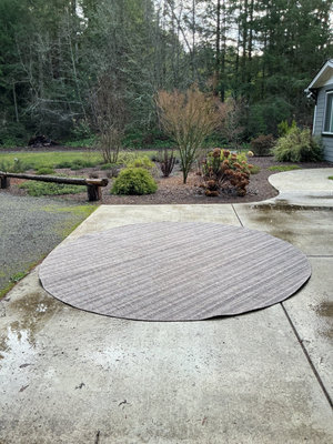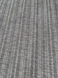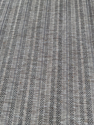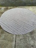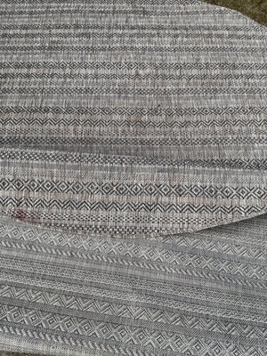 Round woven rug with grey and white geometric motifs in repeating patterns, 118 inches. Some light spots of staining but in good shape.