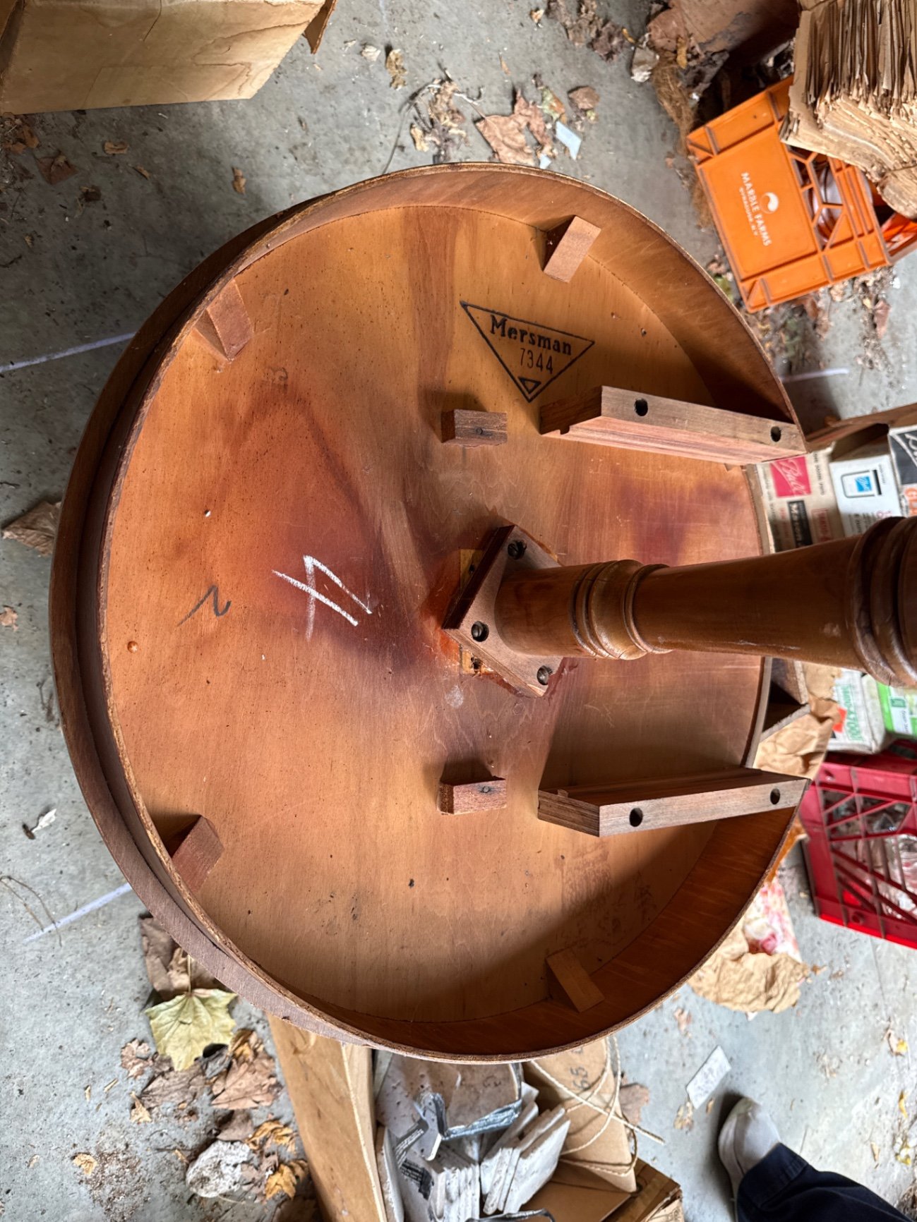 A round wooden dining table on a carved central pedestal with three curved legs. The top shows surface wear and a beveled edge; underside bears a Mersman stamp with model number 7344 and includes rectangular brackets likely used for a leaf attachment. 24x24x26 Located in garage.