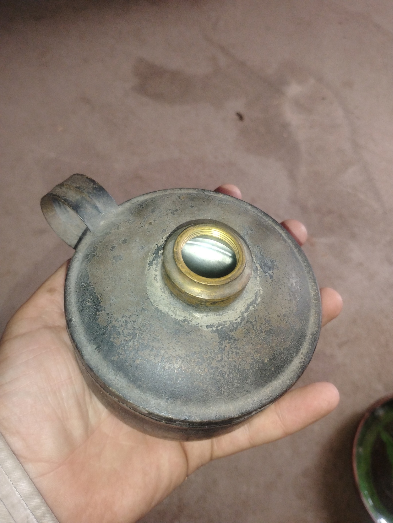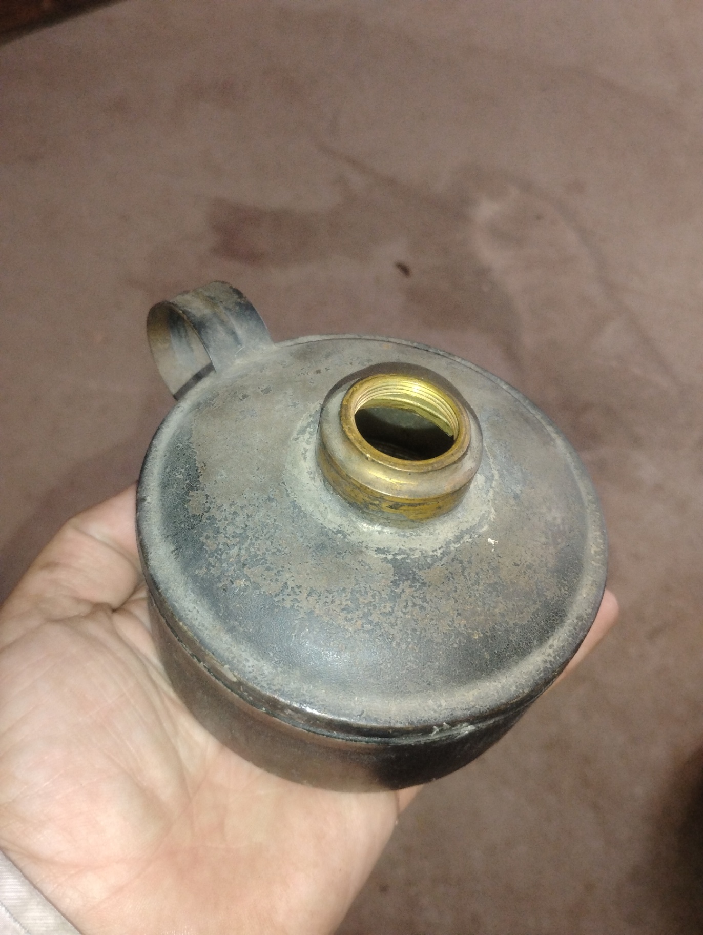 A circular, domed metal canister featuring a brass threaded receptacle in the center of the top and a small integral hanging tab on the side; the surface shows rust and corrosion.