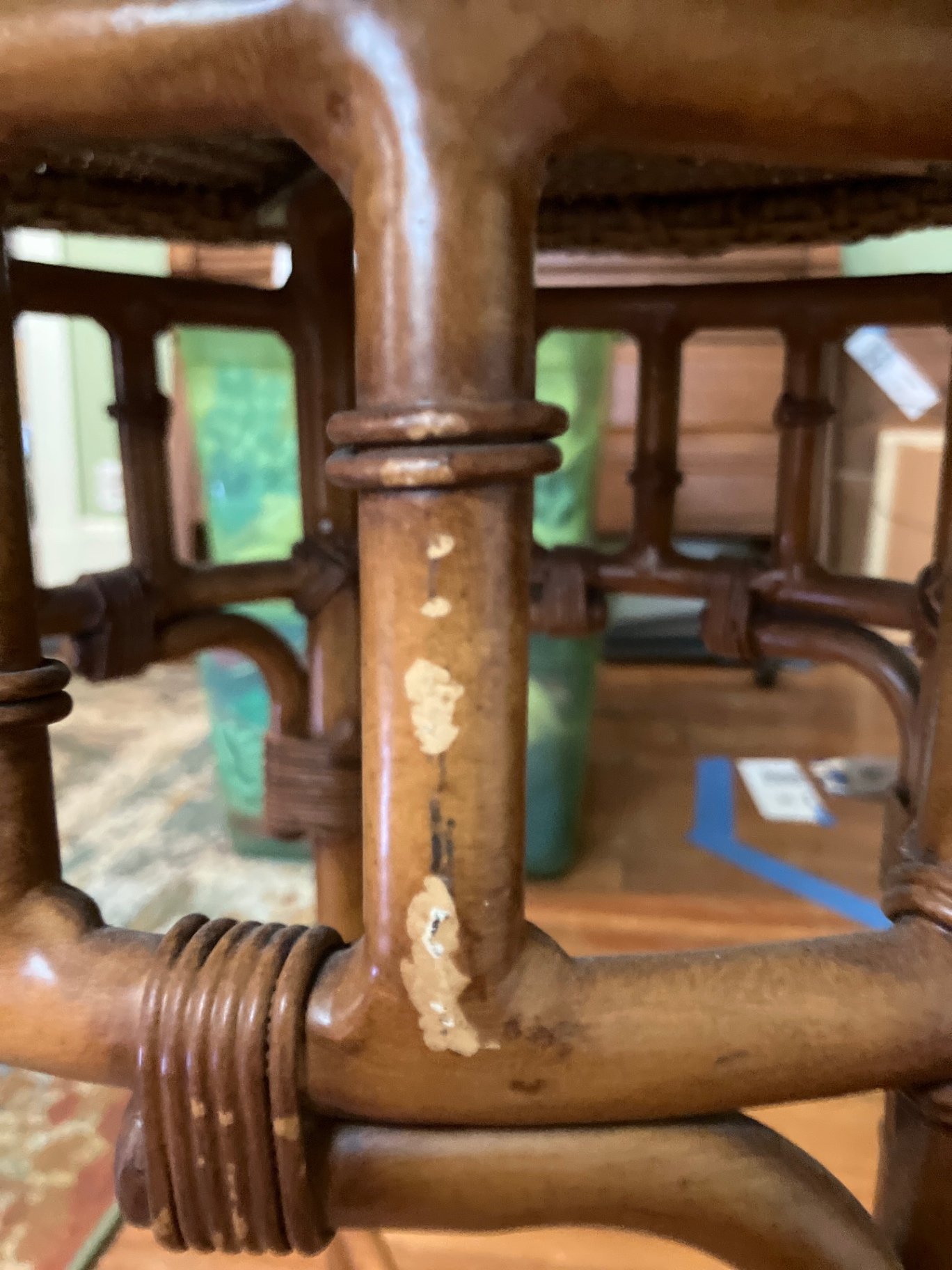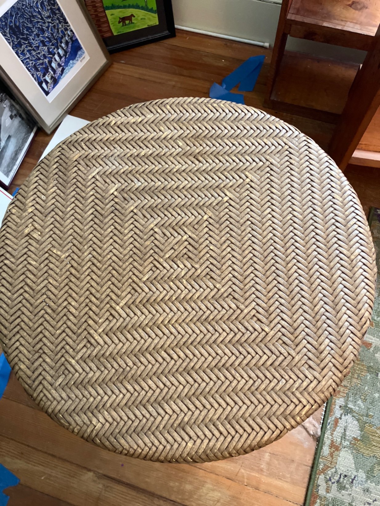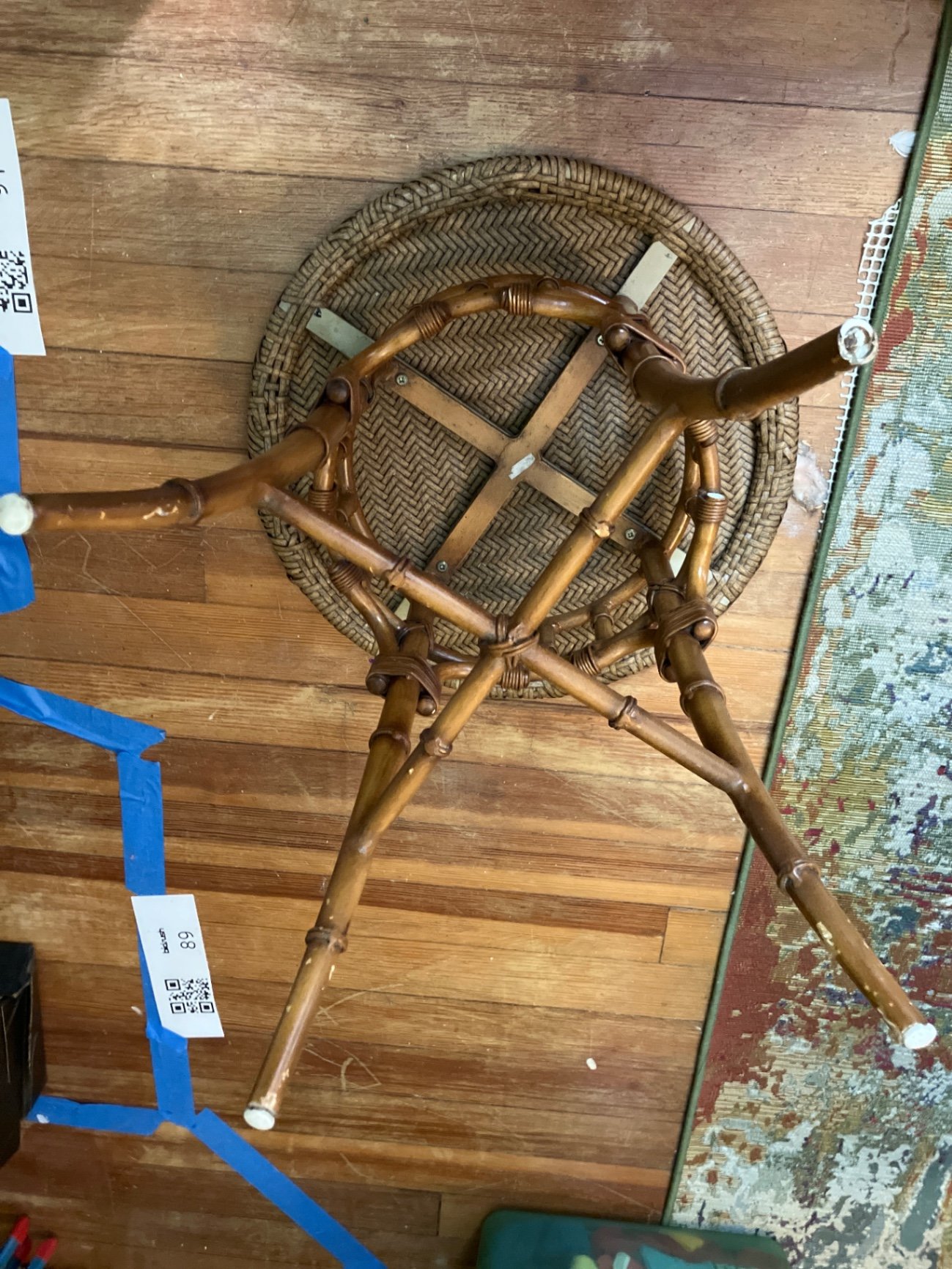 Round woven rattan table with a circular wicker top and a bamboo-style frame featuring multiple supports and cross braces.