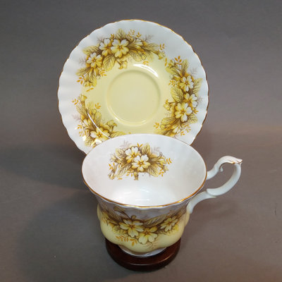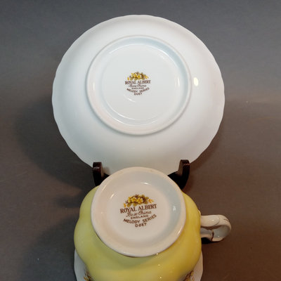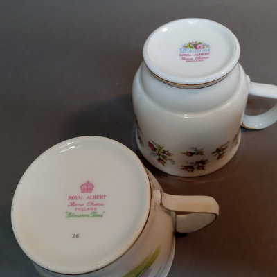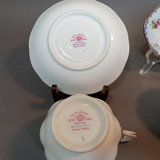 Royal Albert bone china, made in England. Standard size coffee and tea cups, saucers 5.5d. Petit Point China coffee, tea, saucer, creamer, sugar bowl, and oval plate (5.25x8.25). Trillium coffee, tea, saucer. Melody tea and saucer. Cups: Old Country Roses, Silver Birch, Winsome, Blossom Time. 15 pieces.