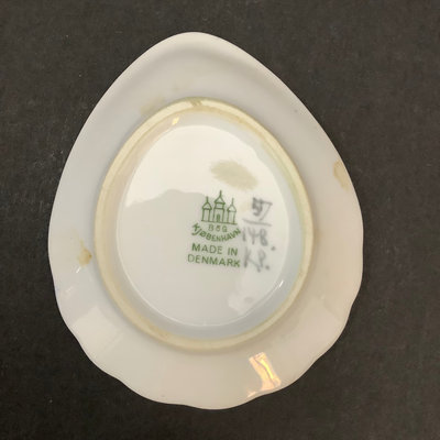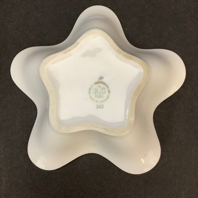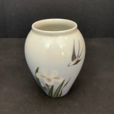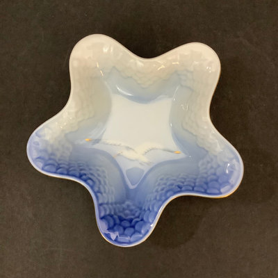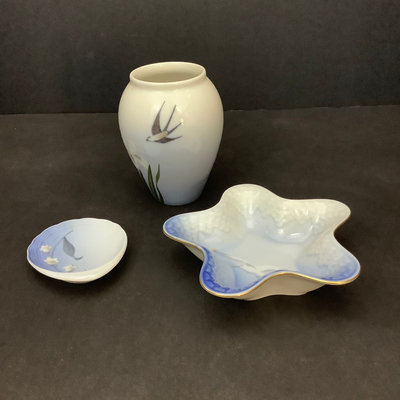 Royal Copenhagen small iris and bird vase, 4.5h. Starfish dish, 5.5d. Shell-shaped lily of the valley dish, 3.5x3. 3 pieces.