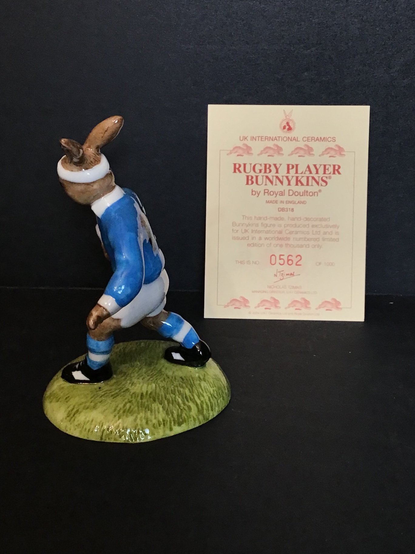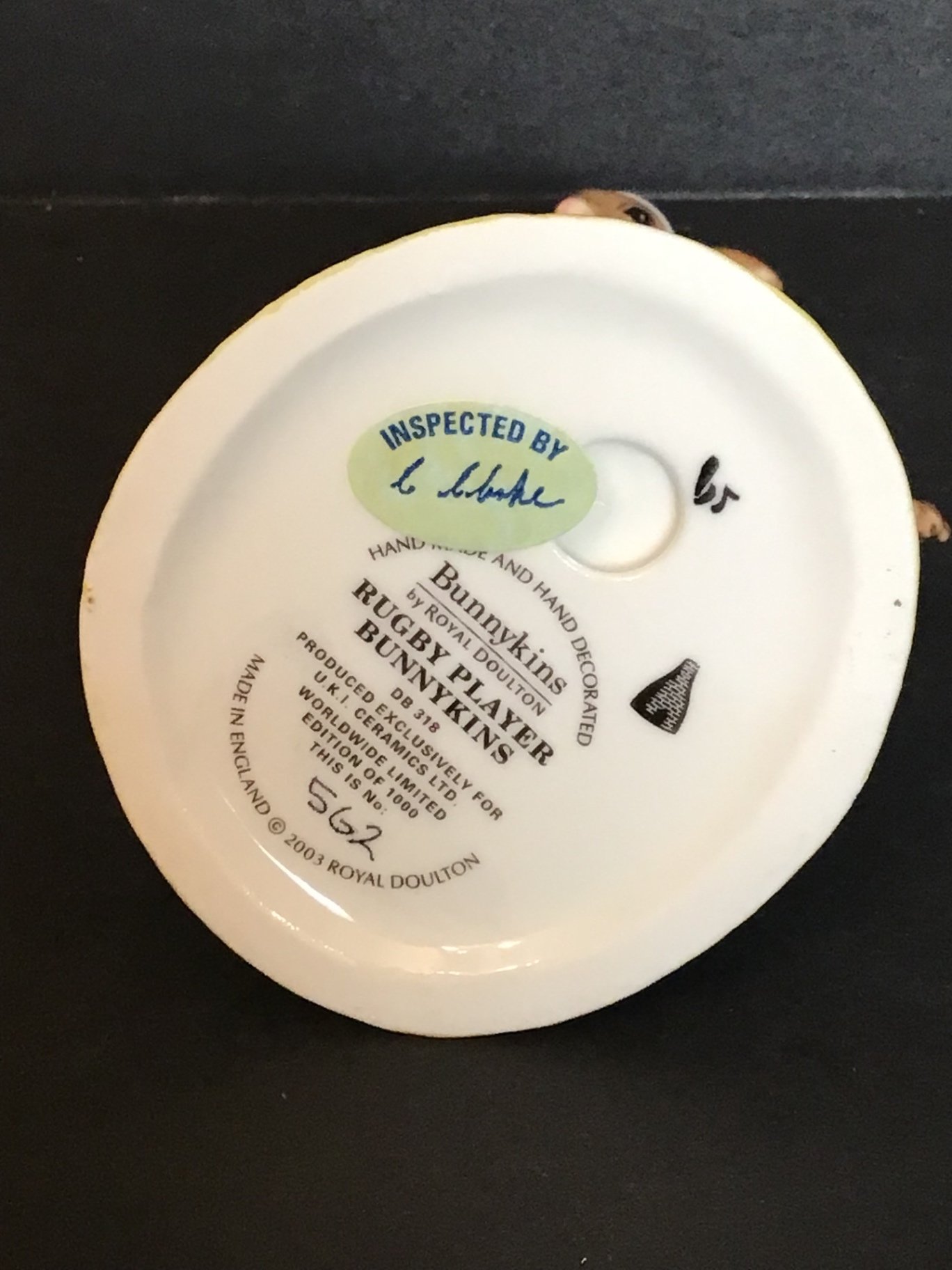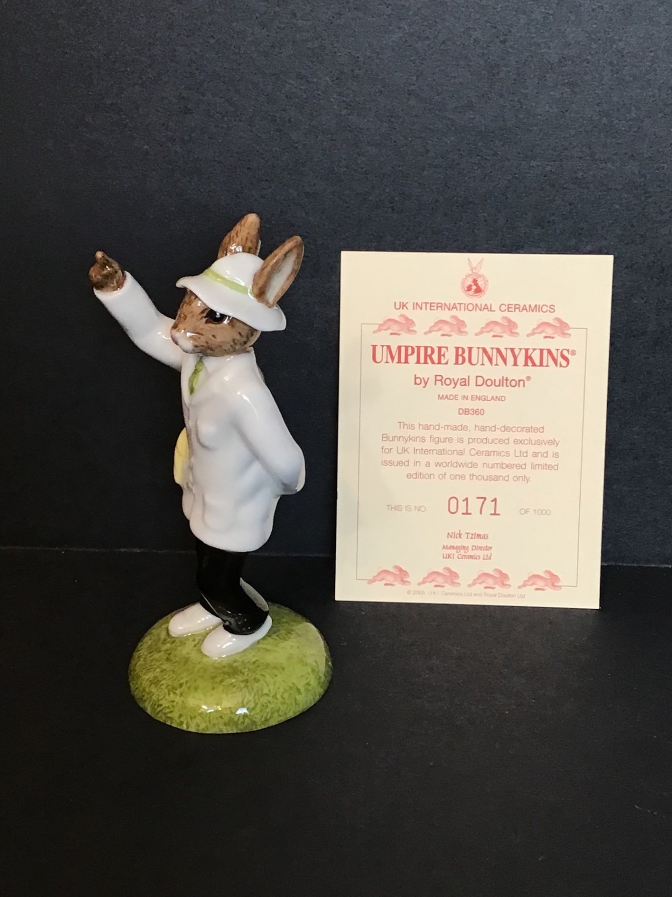 Royal Doulton DB360 Umpire no. 171 of 1000, UK Ceramics, 4.5h. DB216 England Athlete no. 2235 of 2500, UK Ceramics, 4.75h. DB318 Rugby Player no. 562 of 1000, UK Ceramics, 4h. Royal Doulton, made in England unless otherwise noted. 3 pieces.