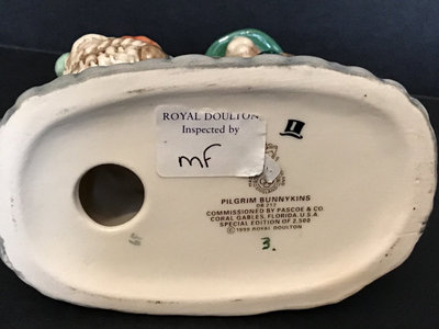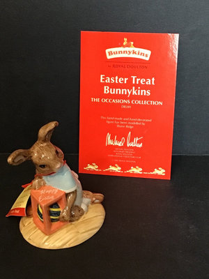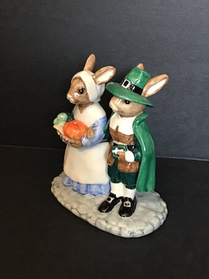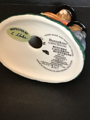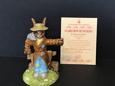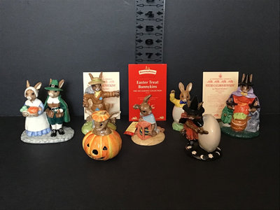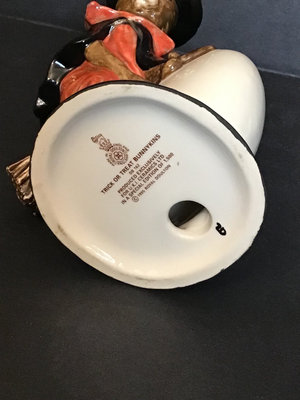 Royal Doulton DB212 Pilgrim no. 3 of 2500, UK Ceramics, 5h. DB359 Scarecrow no. 353 of 1000, UK Ceramics, 5h. DB132 Halloween, 3.5h. DB289 Easter Treat, The Occasions Collection, made in China, 3.5h. DB162 Trick or Treat in a limited edition of 1500, UK Ceramics, 4.5h. DB149 Easter Greetings, 4h. DB293 Witches Cauldron, no. 247 of 1500, UK International Ceramics, 5h. Royal Doulton, made in England unless otherwise noted. 7 pieces.