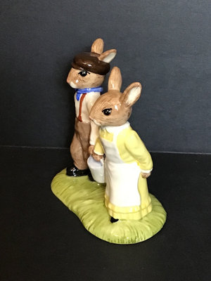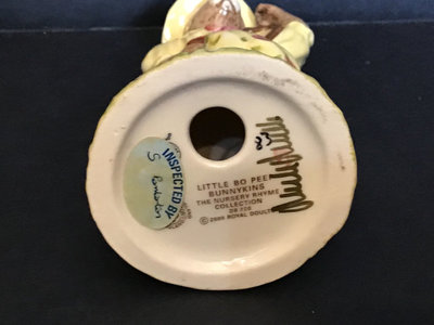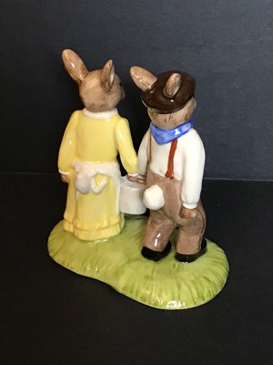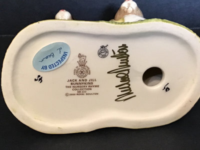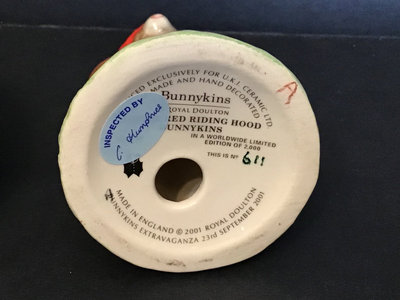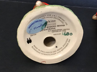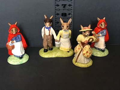 Royal Doulton DB222 Jack & Jill, signed by Michael Doulton, 4.5h. DB220 Little Bo Peep, signed by Michael Doulton, 4.5h. DB230 Little Red Riding Hood no. 611 of 2000 and no. 1680 of 2000, for the UK International Bunnykins Extravaganza in 2001, 4.5h. Royal Doulton, made in England unless otherwise noted. 4 pieces.