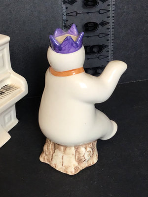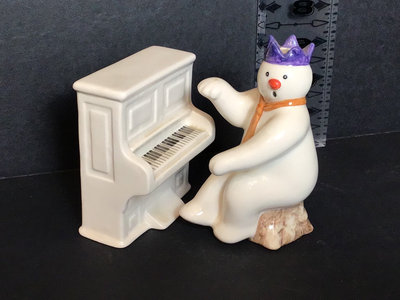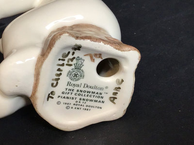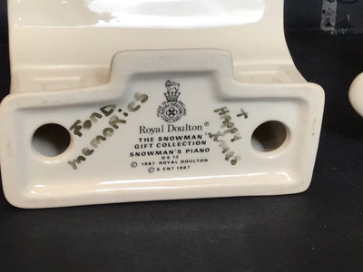 Royal Doulton DS12 Snowman, 4.5h, and Snowman's Piano DS13, 3.75h, from The Snowman Gift Collection, 1987, made in England. Includes handwritten holiday notes to the previous owner on the bottom of each. 2 pieces.