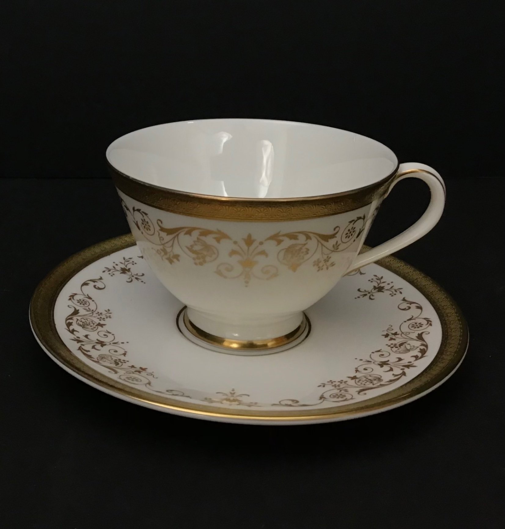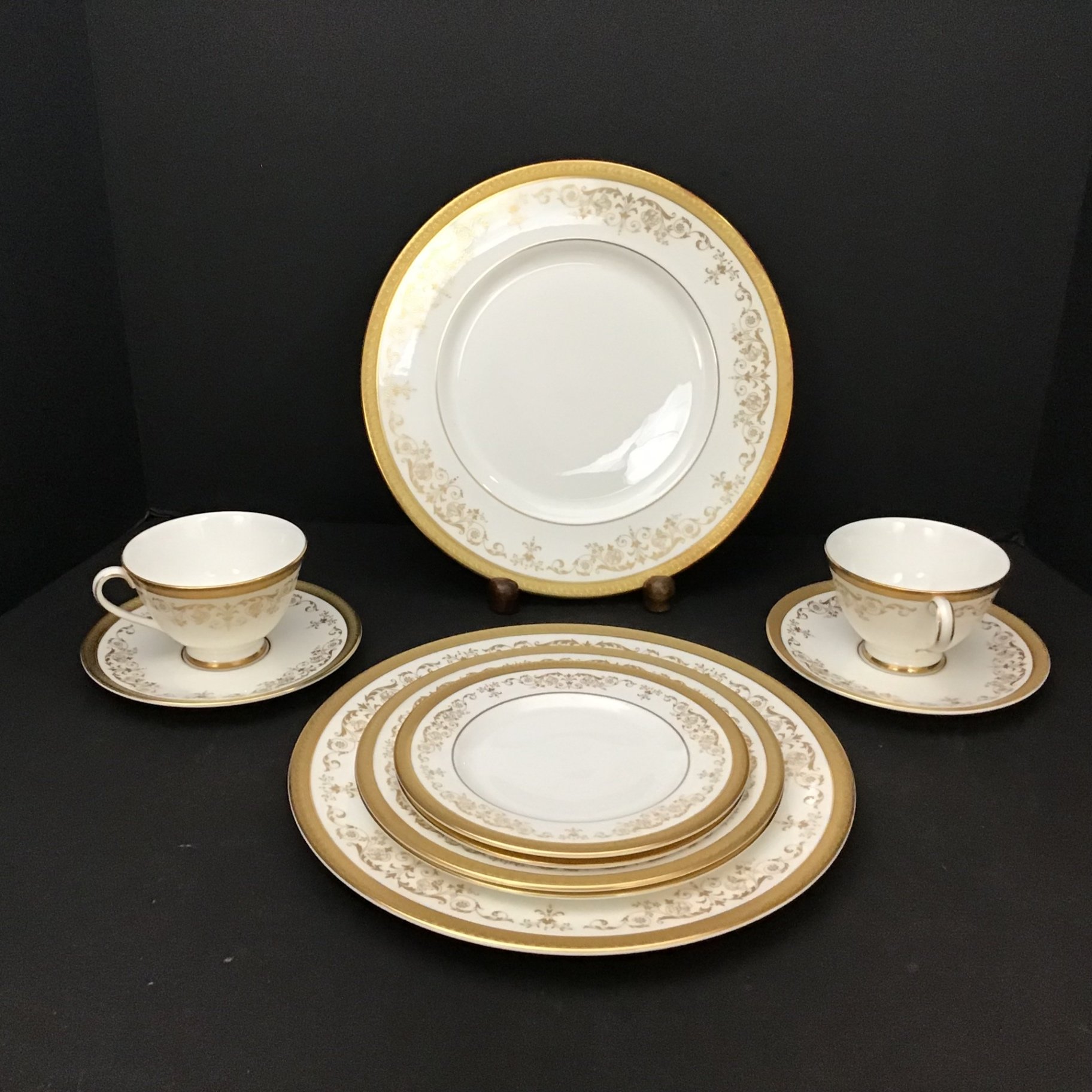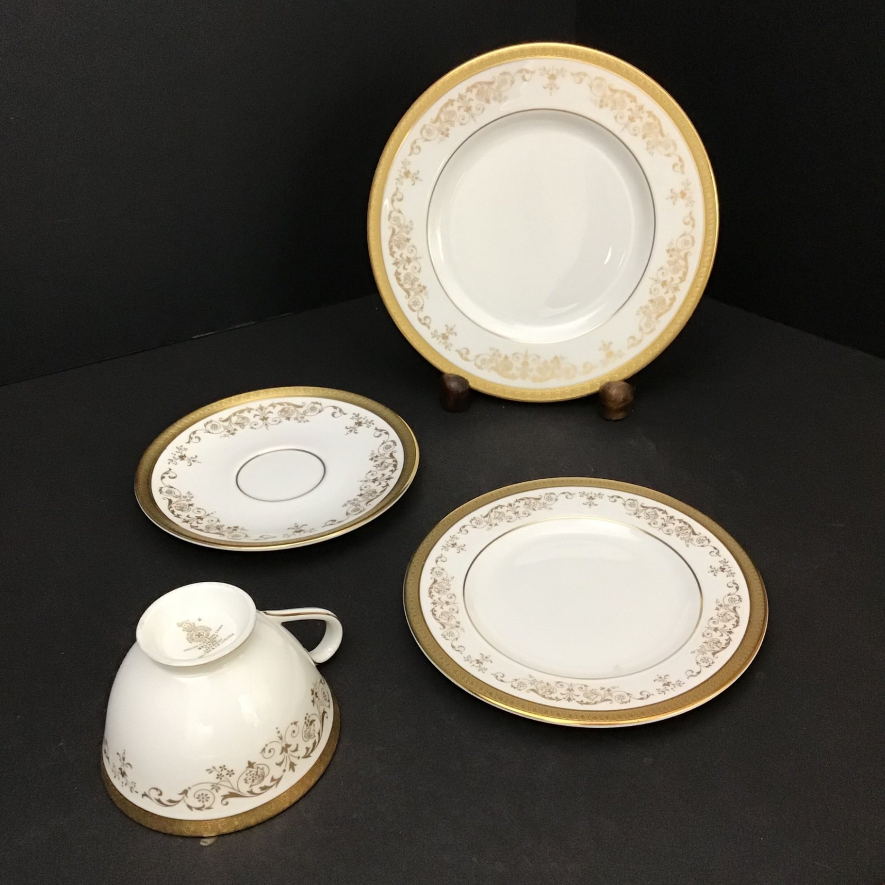 Royal Doulton place settings, Belmont pattern, from Boston’s Shreve, Crump, and Low store on Newbury 10.5d (2) dinner plate, 8d (2) salad plate, 6.5h (2) butter plate and 2 5/8in (2) footed cup and saucer set. Appears unused in original Shreve box and bags. 10 pieces.
