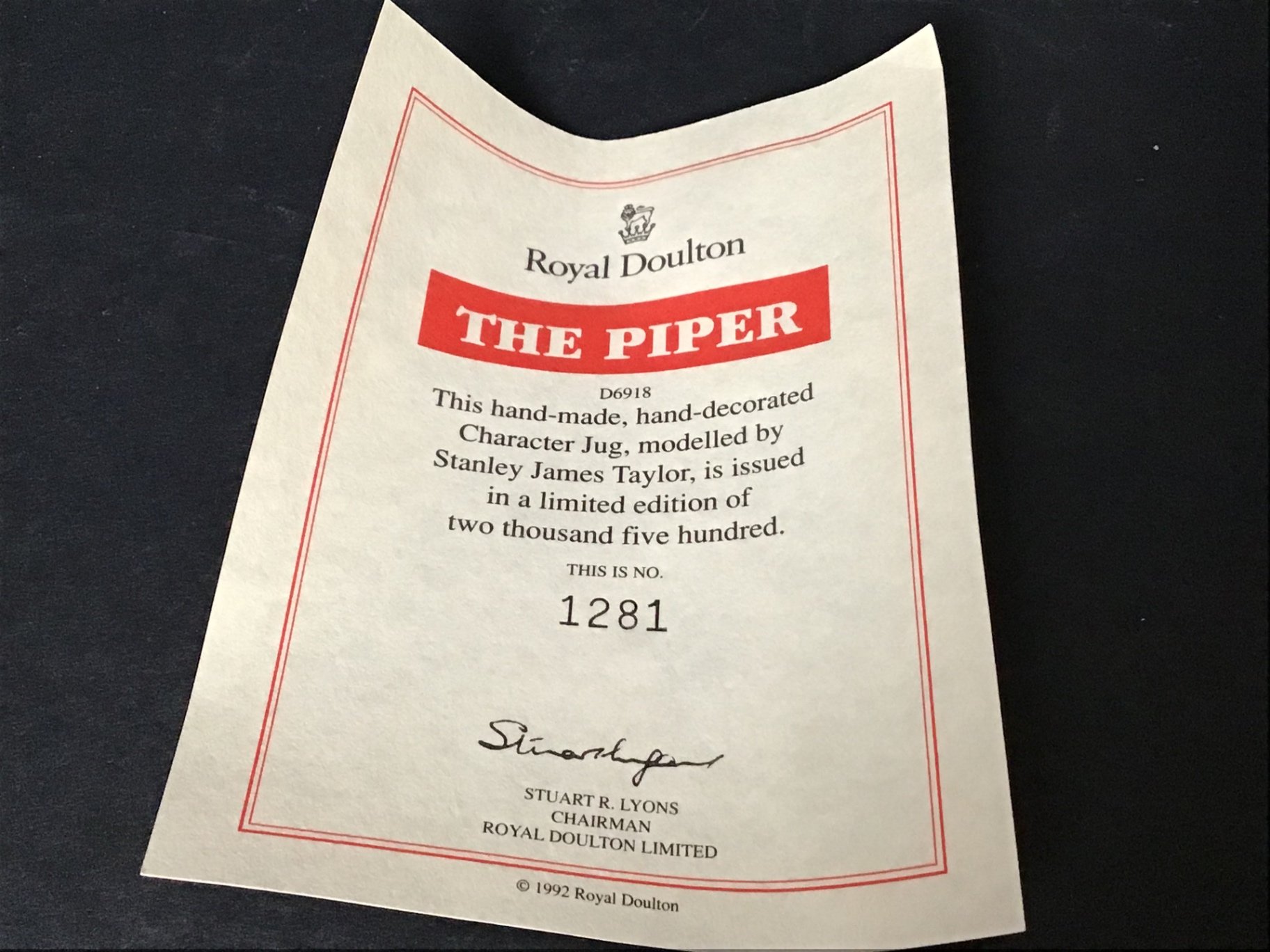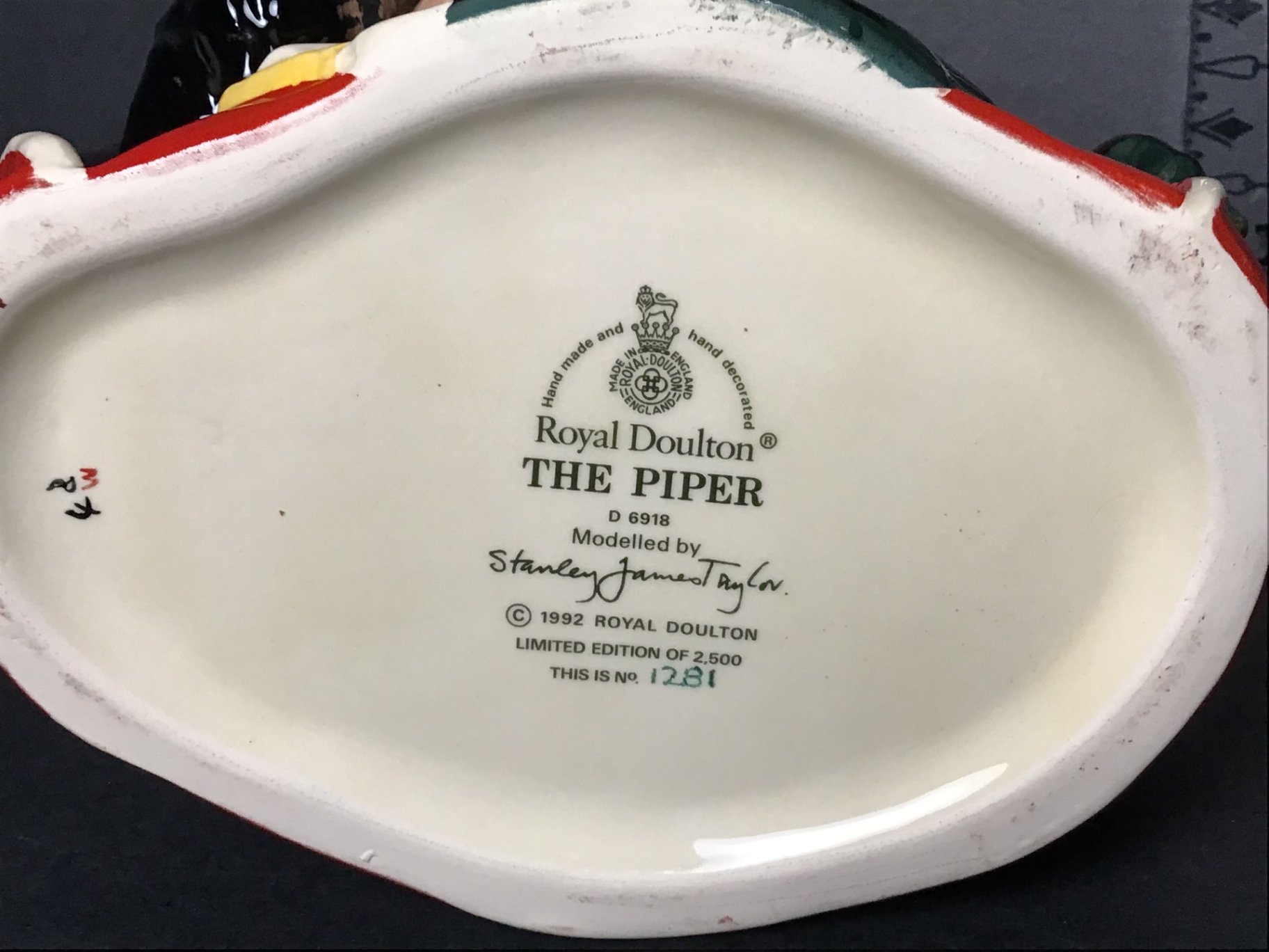 Royal Doulton D6918 The Piper, no. 1281 of 2500, designed by Stanley Taylor. 8.5h. Royal Doulton, made in England unless otherwise noted. 1 piece.