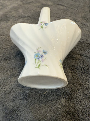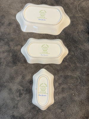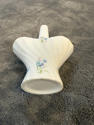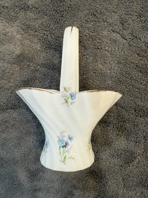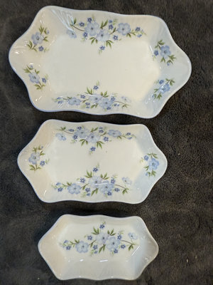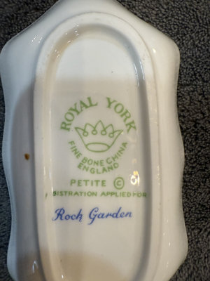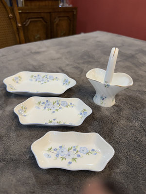 Set of Royal York Petite Rock Garden bone china pieces including three irregular leaf-shaped dishes and a matching pedestal-handled vessel. The items feature blue floral patterns with gold trim and are marked on the bottom with Royal York, Petite, Rock Garden, England. 41/2, 5, 6" Basket 31/2"