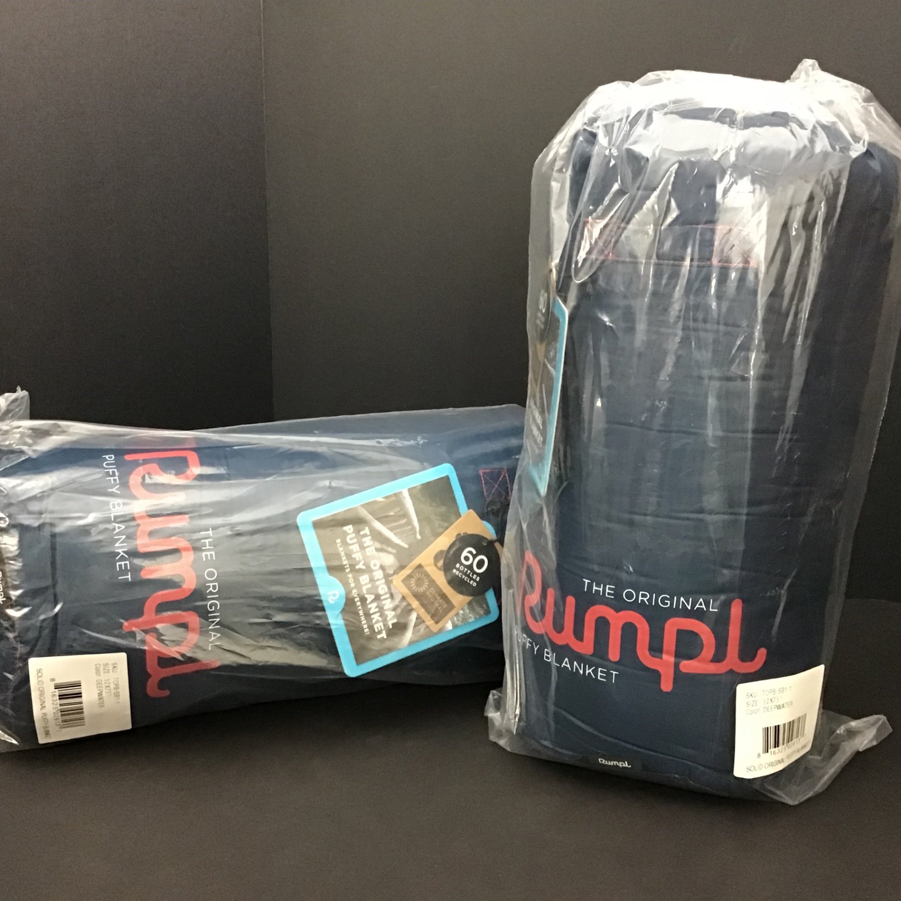 New in plastic Rumpl puffy blankets. Color is deepwater. Size 52x75. 2 pieces.