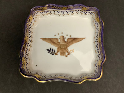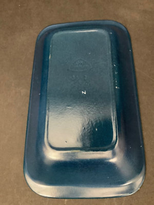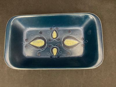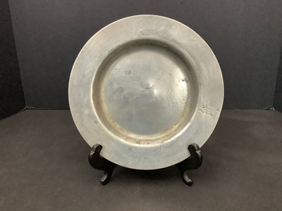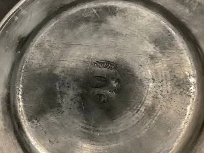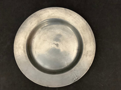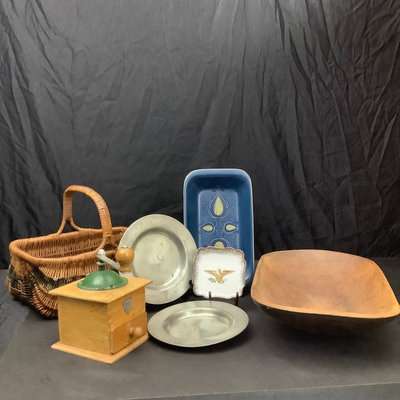 Vintage wood dough bowl 19x11. Hand painted basket, 13.5x8.5x11. Vintage Peugeot coffee grinder, made in France, 5sq x 9h. Antique thick pewter plates, hallmark London, 8d. JIE navy blue ceramic serving dish, no. 35-2, 12x7. Small scalloped trinket dish with gilt eagle design in center, no. 7442, 4.75sq. 7 pieces.