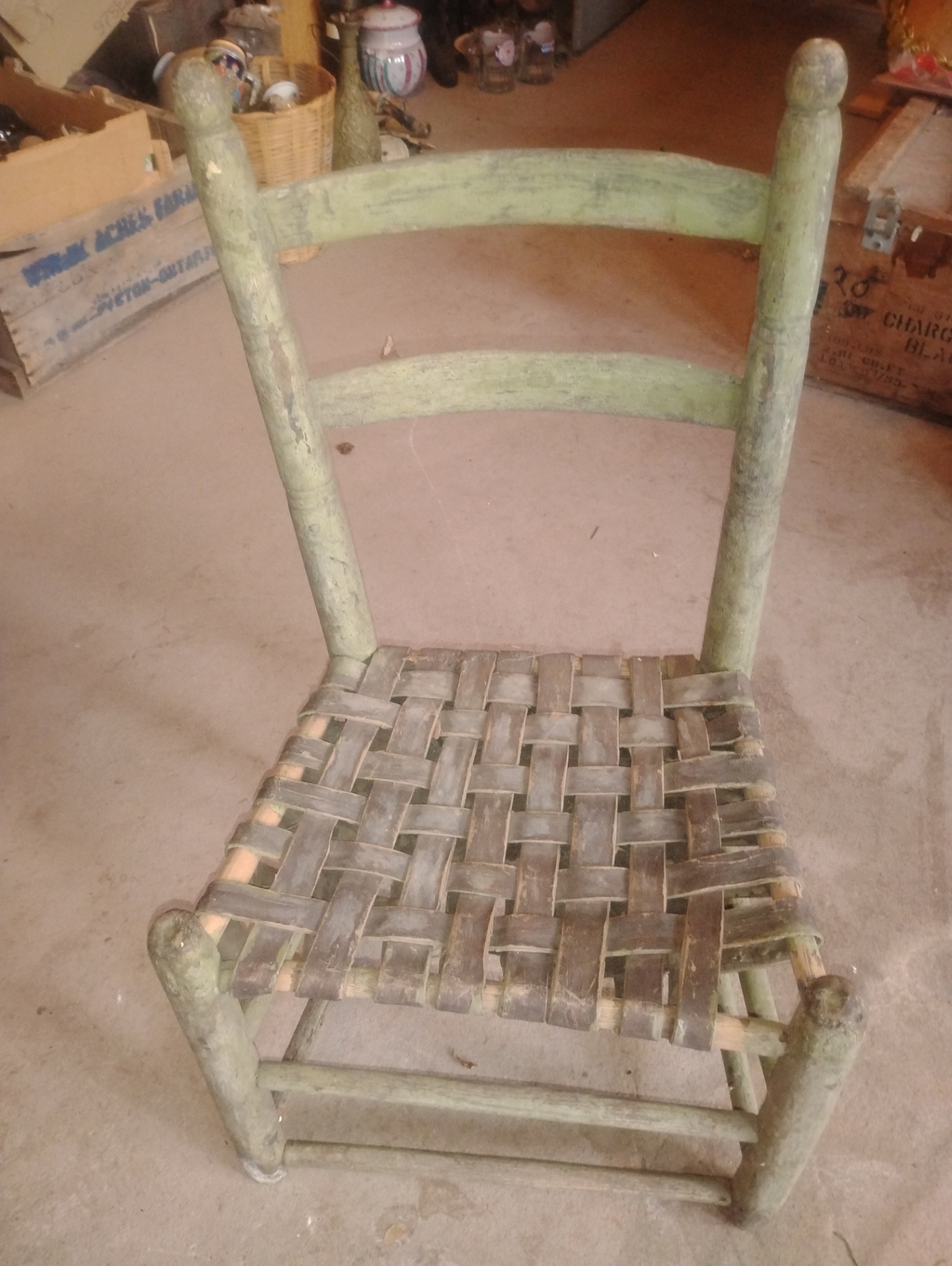 A green-painted, weathered wooden chair with a woven seat made from interlaced strips.