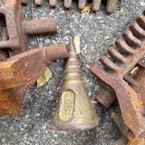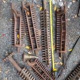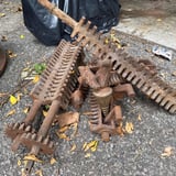 A collection of heavily rusted cast-iron agricultural parts, including multiple long, toothed bars resembling harrow components and various hardware pieces such as clamps, pins, and a conical head. Located in garage.