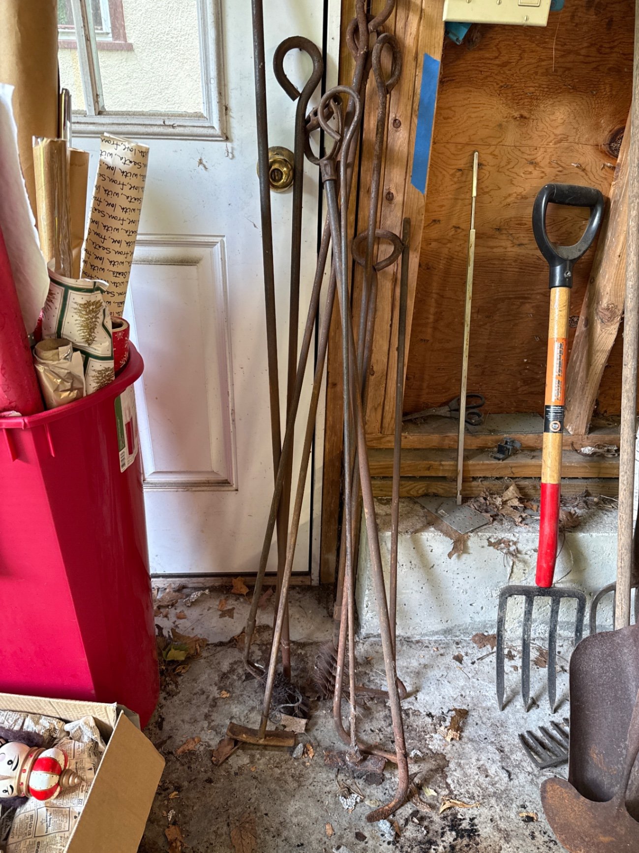 A collection of long, rusted iron fireplace tools with looped handles and curved ends, plus two bristle chimney brushes. Located in garage. (Note the pitchfork in the picture is not part of this lot nor is the tall red item.)