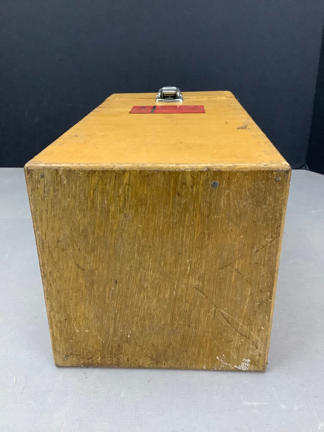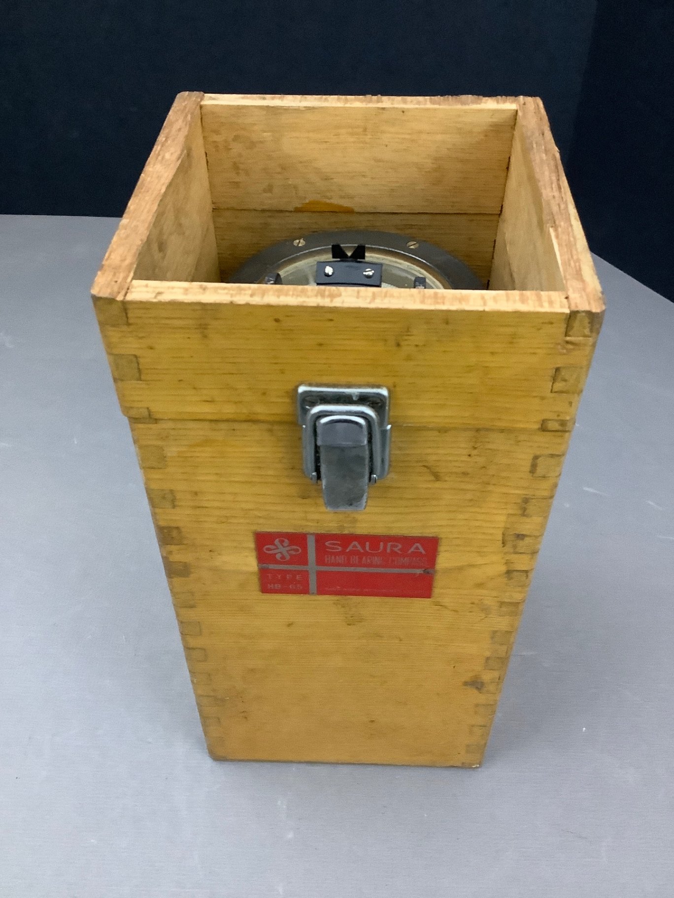Type HB-65, Sauara Instruments Co., Ltd. 5x5x10. Hinge on wooden box is broken, top to lid missing. 1 piece.