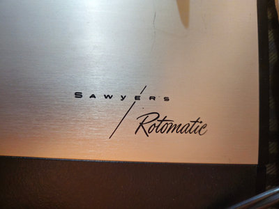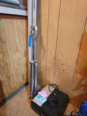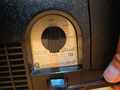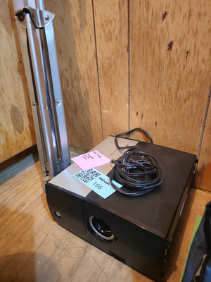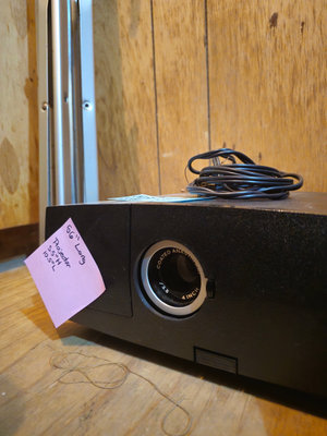 A black rectangular projector with a large circular front lens, a coil of power cables on top, and a long silver screen projector positioned beside it. UNTESTED, as is as found.