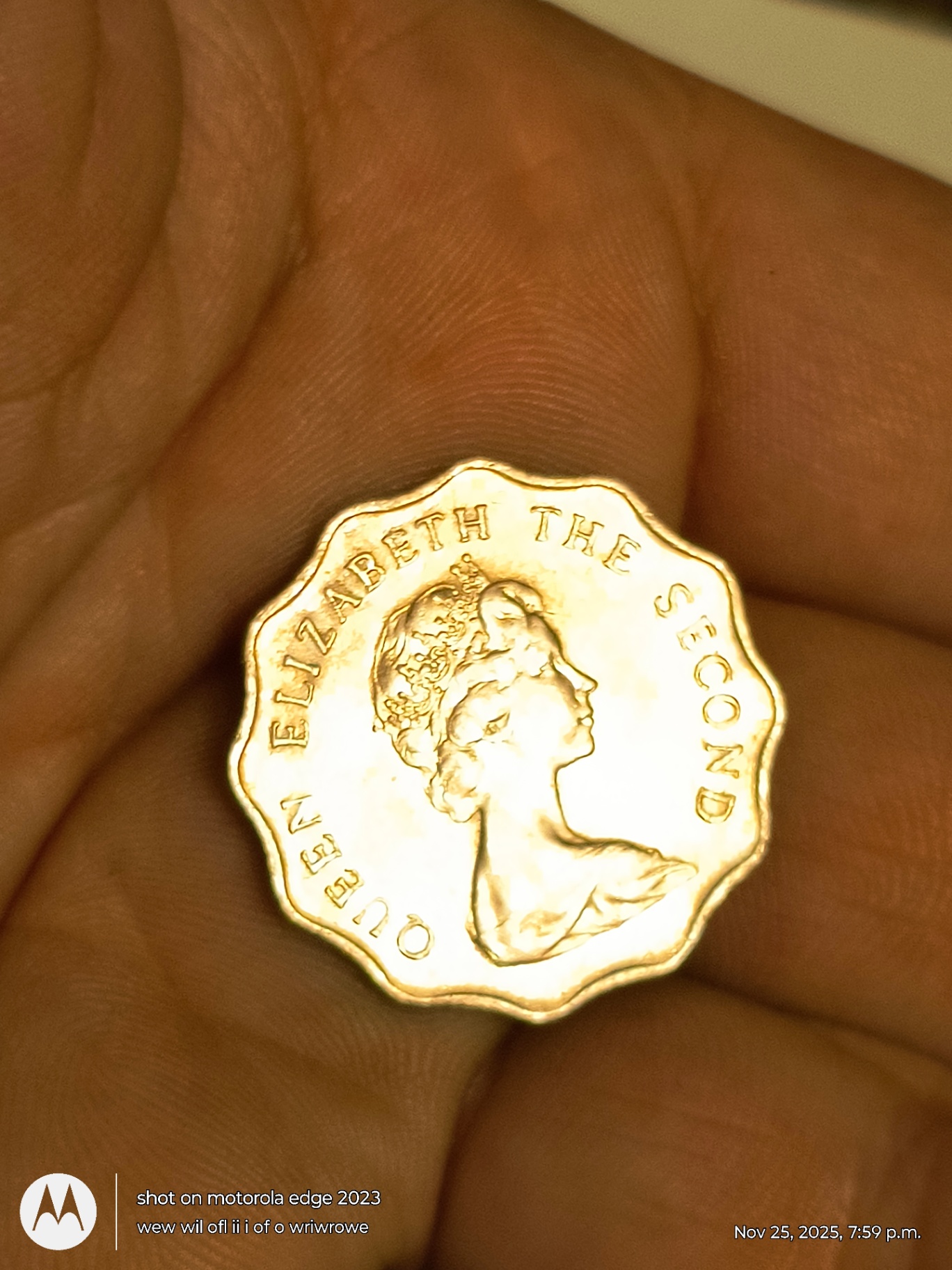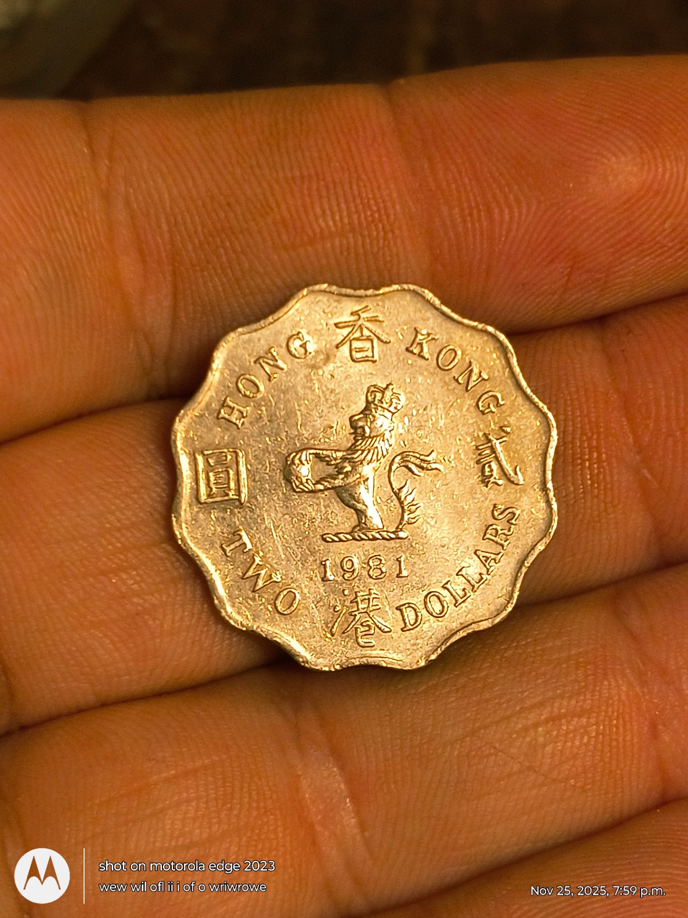 scalloped-edge coins: one Hong Kong one-dollar coin dated 1981 featuring Chinese characters and an animal motif, and another one-dollar coin with a portrait of Queen Elizabeth II and the inscription 'ELIZABETH THE SECOND' around the rim.