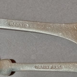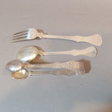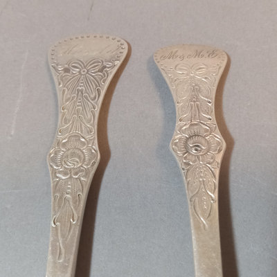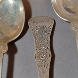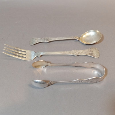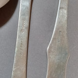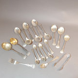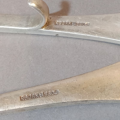 Scandinavian flatware with cabbage rose & bow design on handles, marked 830S. Teaspoons by R. Borke and A. Frisch, overall 54.8dwt. Baby fork, spoon, sugar tongs, overal 54.1dwt. R. Borke spoon with hook and serving spoon, overall 78.7dwt. 2 dinner spoons, overall 45.9dwt. 6 serving spoons, overall 181.6dwt. 20 pieces.