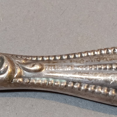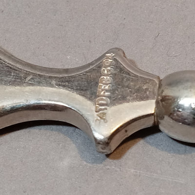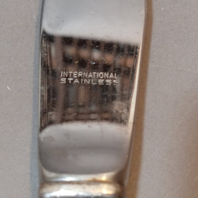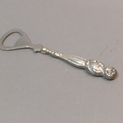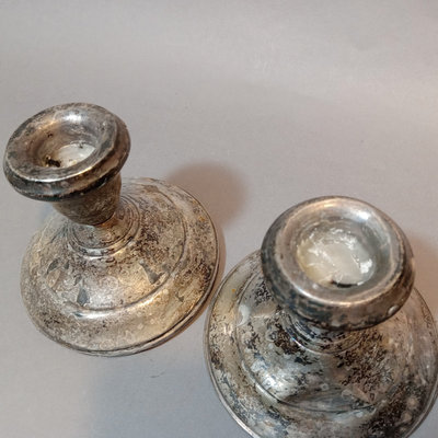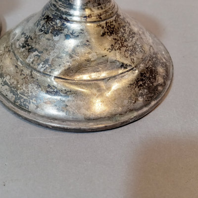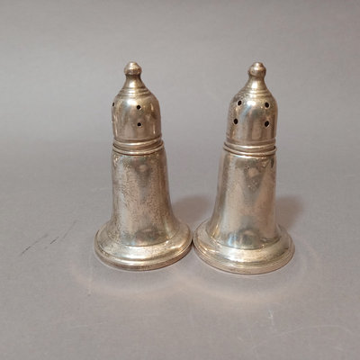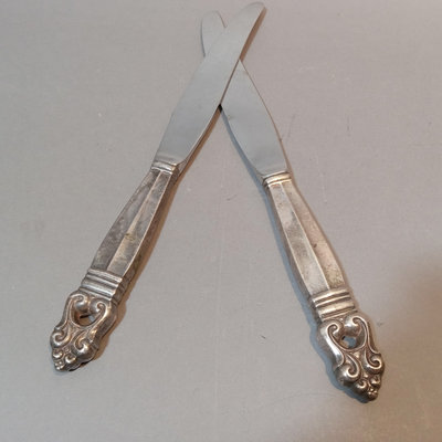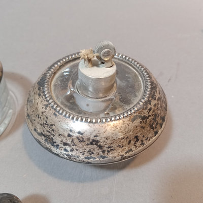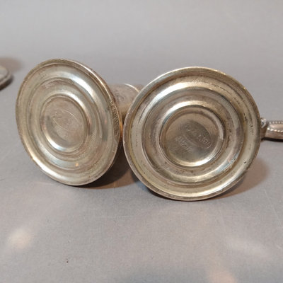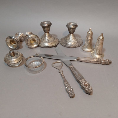 Schreve, Crump, & Low Inc. weighted sterling salt and pepper shakers, 3.25h. Screw-in candle holder tops, 3.5h. Candle holders, dented, 3.5h. Pair International Silver Co. dinner knives, Royal Danish pattern, stainless knife/sterling handles. Bottle opener, stainless top/sterling handle. Sterling and glass Frank M. Whiting lighter and ash receiver. 11 pieces.