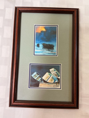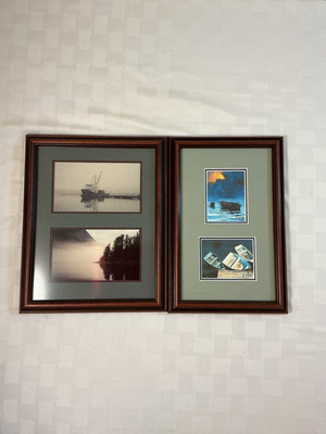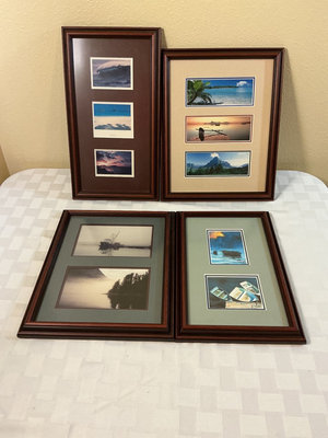 A collection of several multi-panel framed art prints depicting boats, seas, and coastal landscapes. The frames are predominantly dark wood with green, beige, or brown mats, each containing two or more small prints illustrating ocean scenes. Largest measures 10 inches wide and 12 inches tall.