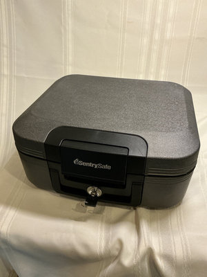 A small black SentrySafe portable security safe and a red and white COLCASE fire protection pouch. Key is included.