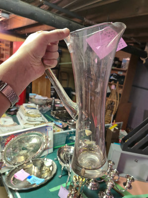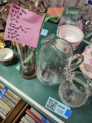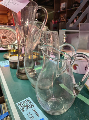 A collection of clear glass pitchers and a carafe with handles, along with additional glass vessels and related glassware items. **BRING OWN PACKING MATERIALS