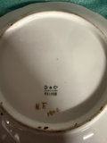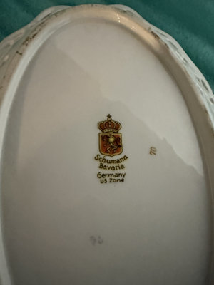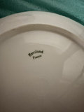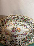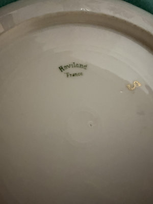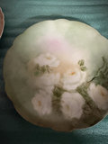 A set of four porcelain plates featuring floral motifs and gilded borders. Designs include pastel gradient backgrounds with berry and rose patterns and a detailed pierced-border plate with multicolored flowers; backs show marks from Haviland France and Schumann Bavaria, US Zone, indicating European origin and early 20th century production.