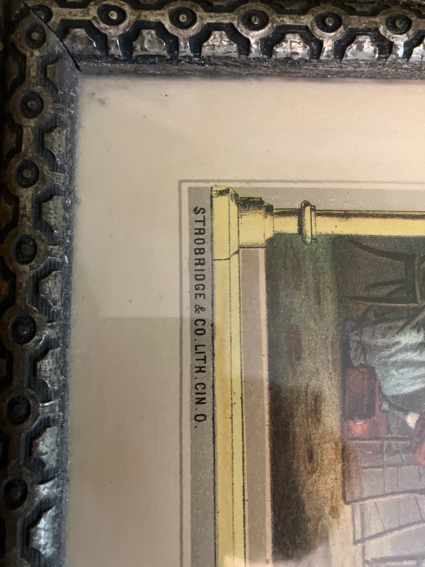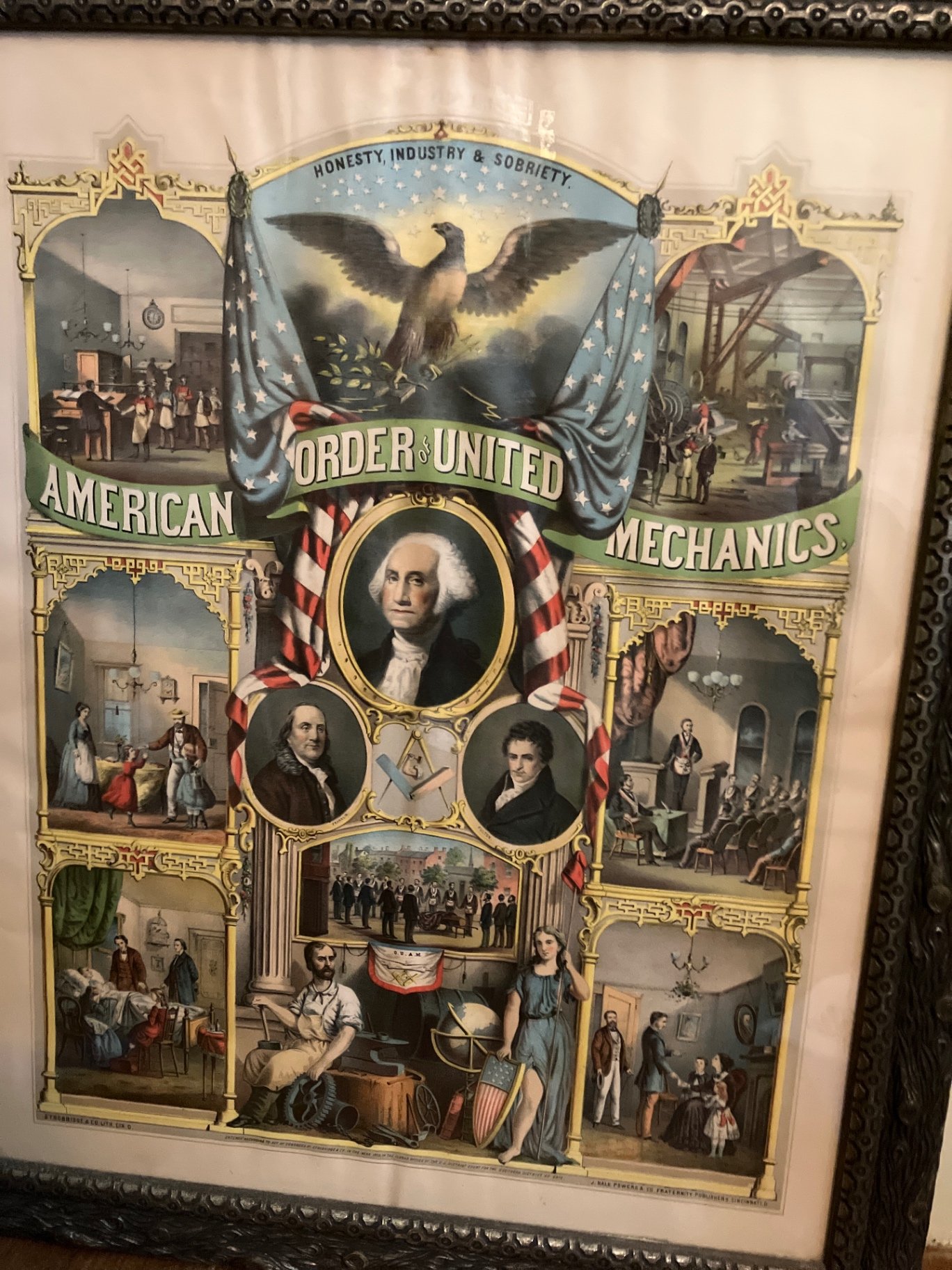 A collection of framed artworks: a large decorative poster titled Order United American Mechanics featuring an eagle and multiple panels; a monochrome city street scene engraving in a wooden frame; and a smaller framed print with a light mat. The back of frames and hanging hardware are visible.
