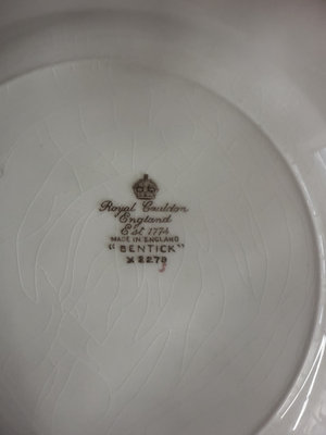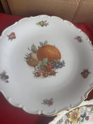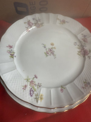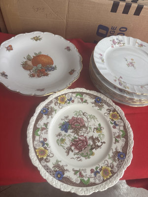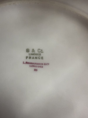 Six decorative porcelain dinner B& C limoges in multiple patterns, including a central fruit motif plate and an intricately bordered floral plate, with varying edge styles; underside features maker marks from English and French manufacturers. 1 Beentick Royal Cauldon, 1 Schumann