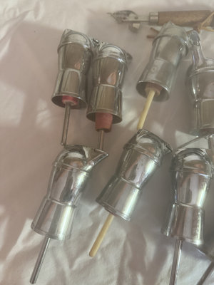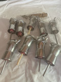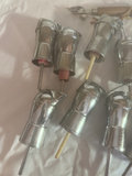 A collection of identical shiny metal cylinders with attached rods; some have colored red or pink rings and latches, forming a grouped set of hardware parts.