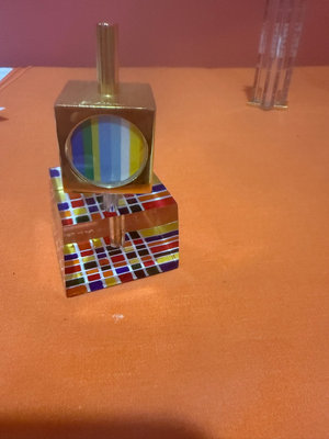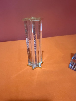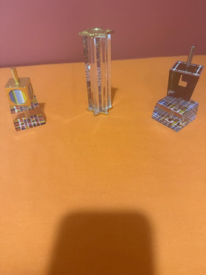 Three small decorative glass sculptures featuring mosaic-patterned bases and vertical clear prisms; one has a square golden top with a circular yellow-blue motif, another is a tall prism column, and the third has a dark square element atop a mosaic base.