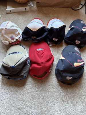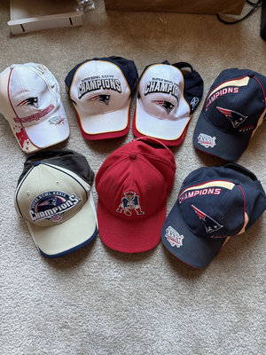 A collection of seven Patriots NFL championship baseball caps in assorted colors featuring 'Champions' patches and team logos.