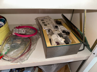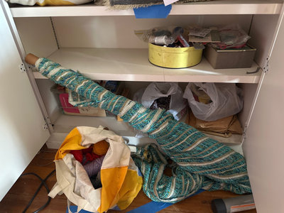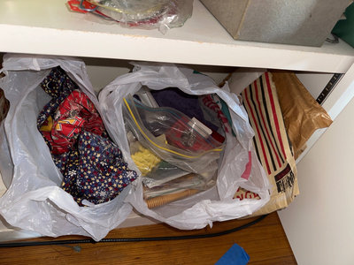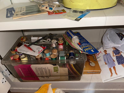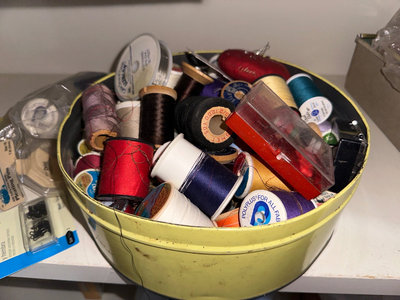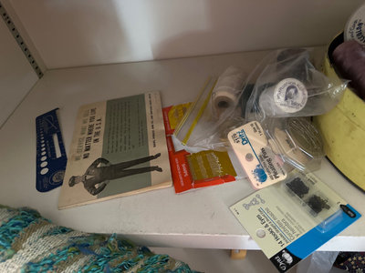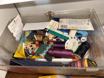 A mixed assortment of sewing and textile craft materials, including colorful yarn skeins, fabric scraps, spools of thread, buttons, trims, an eyelet kit, pattern booklets, and various small notions stored in bags and containers.