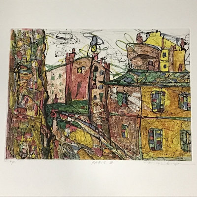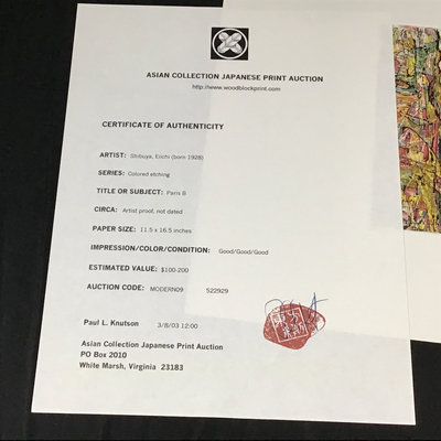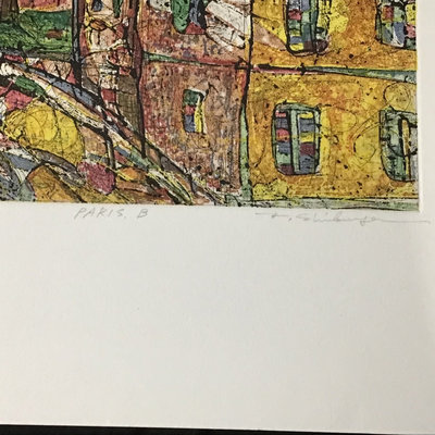 Eiichi Shibuya (Japanese, 1928 - ). "Paris, B" colored etching, artist proof, unframed, with COA from Asian Collection Japanese Print Auction. 11.5x16.5. 1 piece.