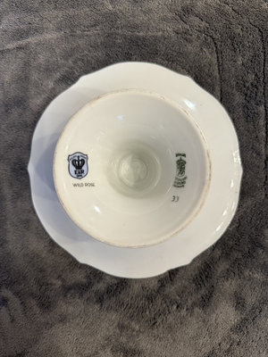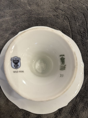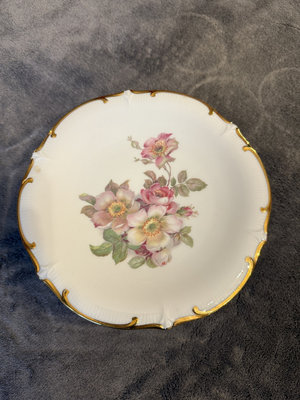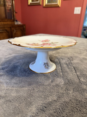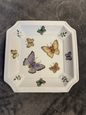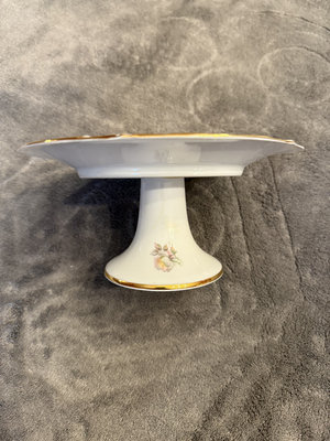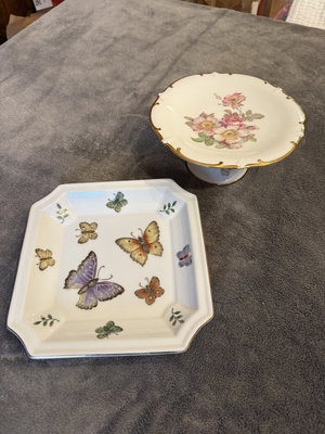 Two porcelain pieces: a square decorated plate featuring butterflies and a floral-pattern pedestal cake stand with gold trim. 8x8 and 71/2 approx