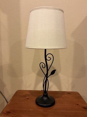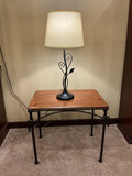 A wooden-top side table with a black iron frame and curved scrollwork, topped by a white fabric-shaded table lamp. Side table is 25 inches wide by 16 inches deep and 21 inches tall. Top surface has some scratches. The lamp is 27 inches tall.