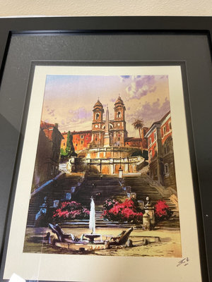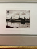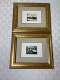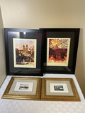 A collection of framed art depicting cityscape scenes in color and black-and-white, presented in black and gold frames with multiple mat borders. Could be originals or signed prints can not tell without taking them out of the frame. Black framed art measures 16 inches wide by 20 inches tall and gold framed prints are 13 wide and 11 tall.
