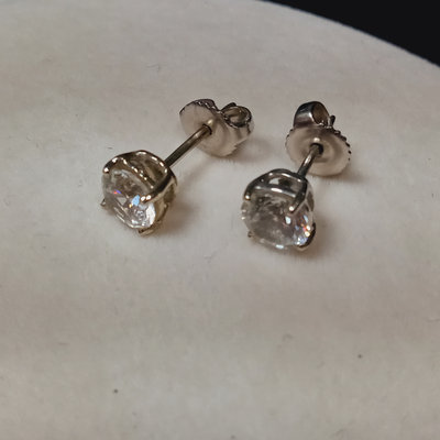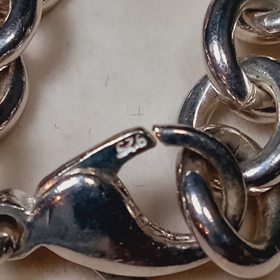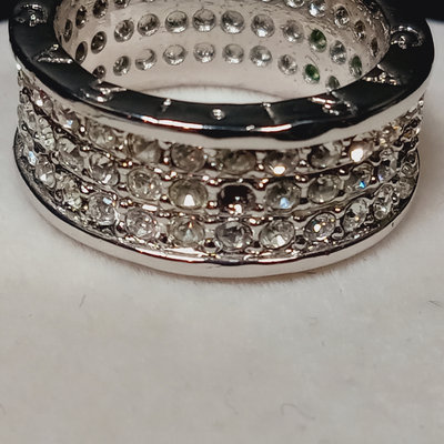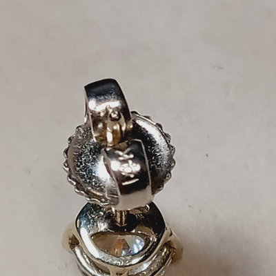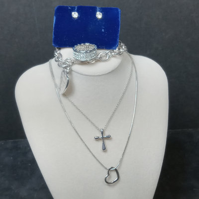 Jewelry perfect for travel or a child/young adult - looks like the real thing but you won't be sad if it gets lost! Pair of stud earrings with 5.5mm / 1.92ct clear crystal stones with 14K stamped on the earring backs only, not on the stud. 17in snake chain with 925 stamped on a link at the clasp, with open heart pendant, no marks, untested. 17in dainty chain with 925 stamped on a link near the clasp and on the back of the cross pendant, no other marks, untested. Famous jeweler-inspired "Return to..." chunky bracelet with heart charm, 925 on the clasp and the charm, but acid test on back of charm suggests plating, as does the lack of smooth soldering on the links. Famous-maker inspired ring with three bands of clear stones, two tiny stones are missing, ladies size 7. 5 pieces.