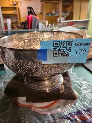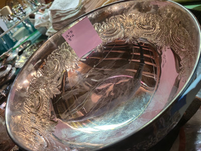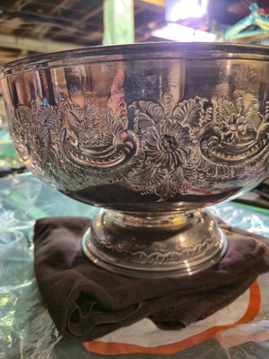 A silver-plated, footed compote bowl with elaborate floral engravings around the exterior and rim. The interior is reflective and bears electroplate maker marks. A blue label is affixed to the rim. ** BRING OWN PACKING MATERIALS