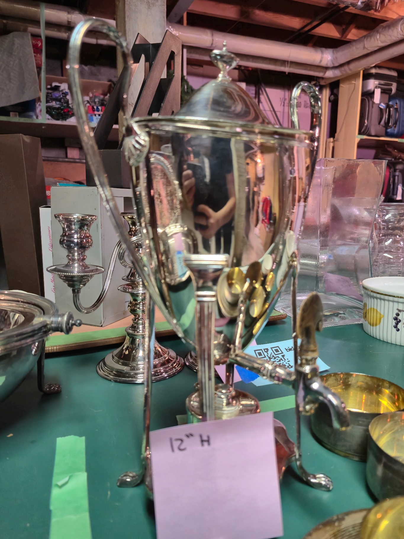 A group of silver-plated items including teacups and saucers, small bowls, stacked plates, and samovar. **BRING OWN PACKING MATERIALS