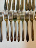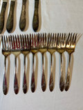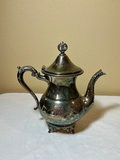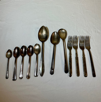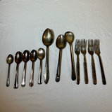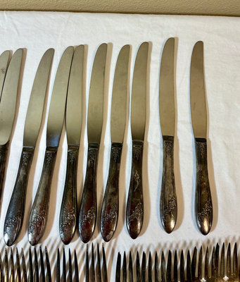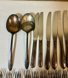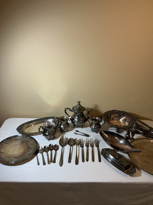 Collection of silverplate items including a lidded teapot, two cream/sugar vessels, a large engraved platter, two decorative bowls, a shell-shaped dish, a glass-lined butter dish, a matched set of flarware containing 8 small forks, 10 large forks, 10 knives, two serving spoons, one spoon and an appetizer fork and lastly a random collection of flatware items.