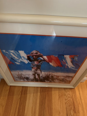 A framed Simbari print depicting a child holding a colorful banner on the beach