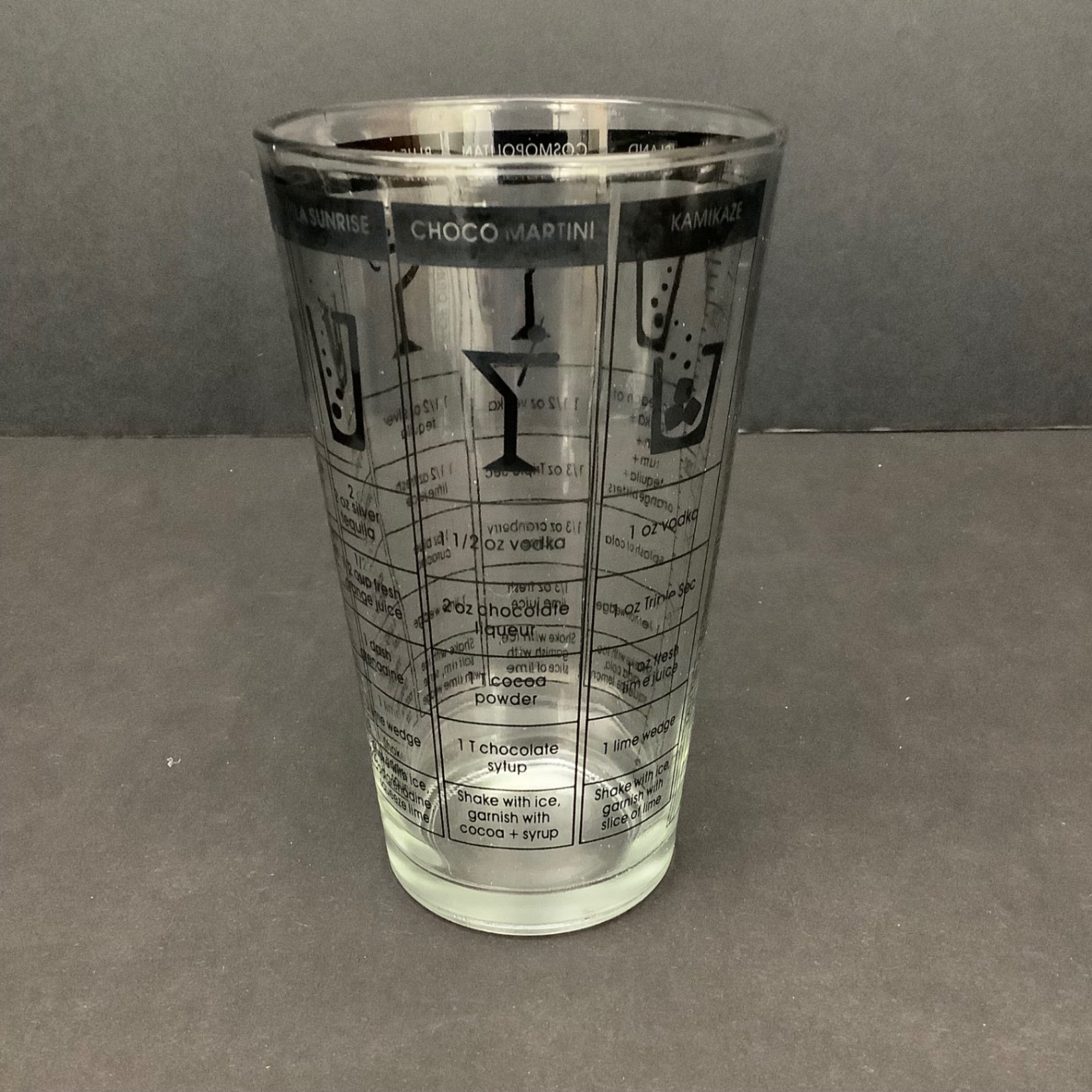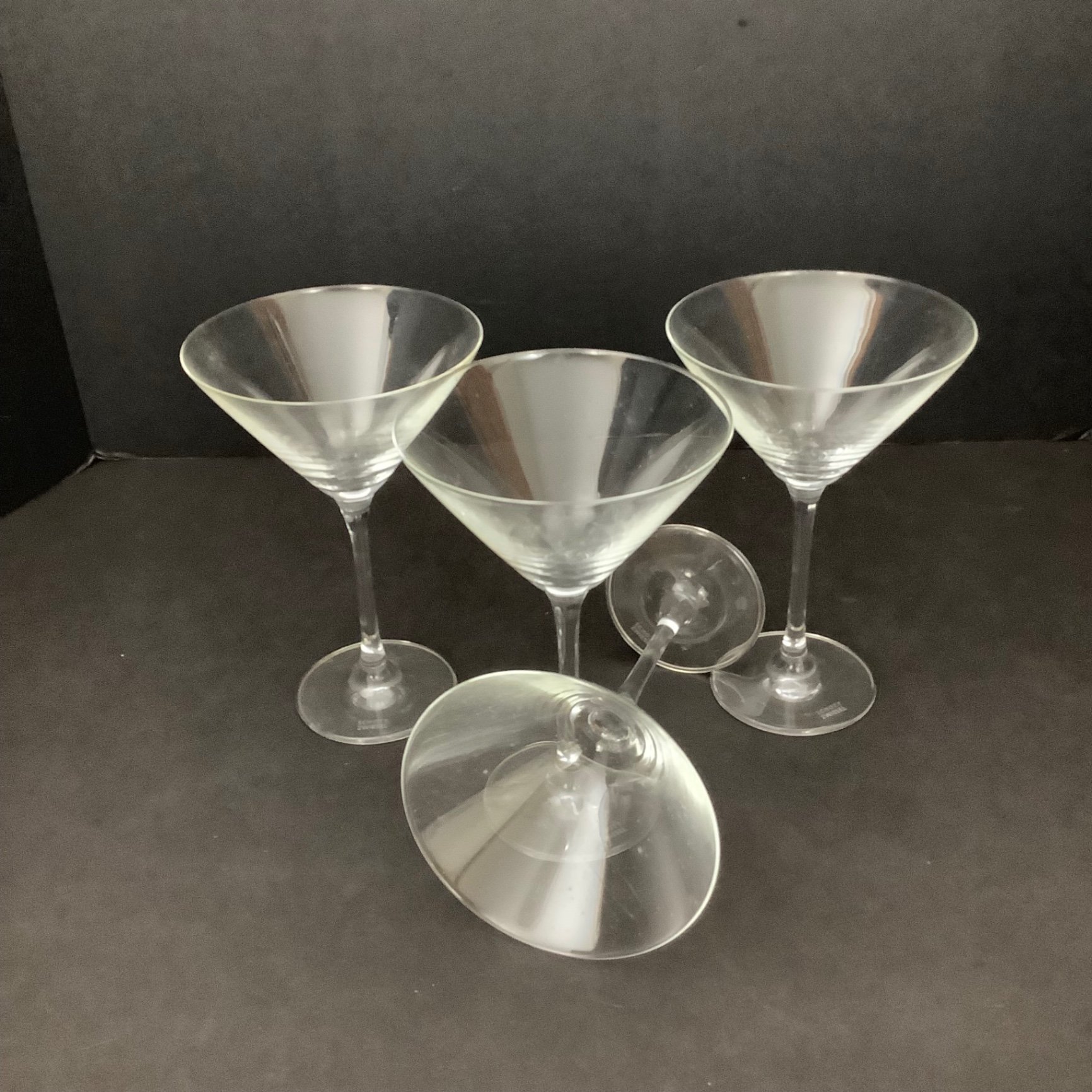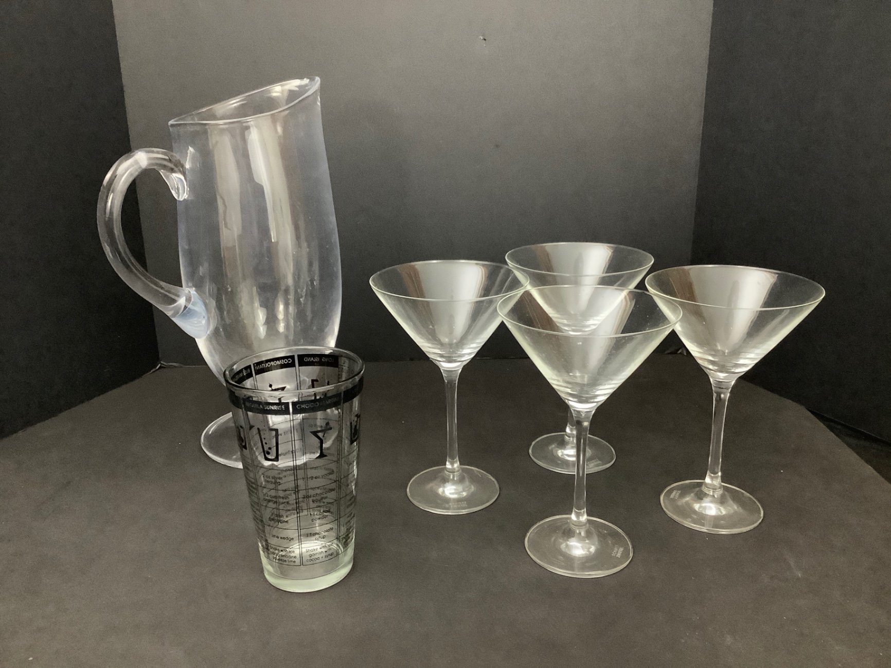 Simon Pearce hand blown footed pitcher, 12.5h. Set of Scott Zwiesel Classico martini glasses, 7h. Glass measuring/drink recipe tumbler. 6 pieces.