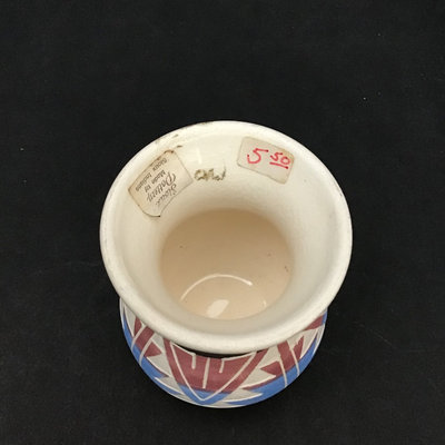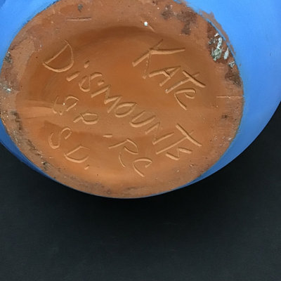 Sioux Pottery, South Dakota. Kate Dismounts (nee Katherine Chasing Horse, 1931-1986), hand painted bands of color on terracotta, 10h. Small pot, signed Garnett S.P.R.C. S.D. on bottom, 3.5h. 2 pieces.