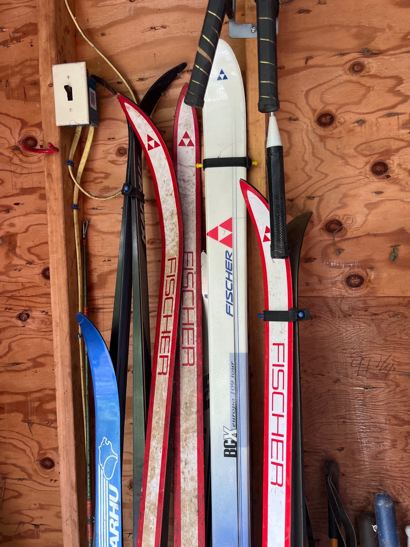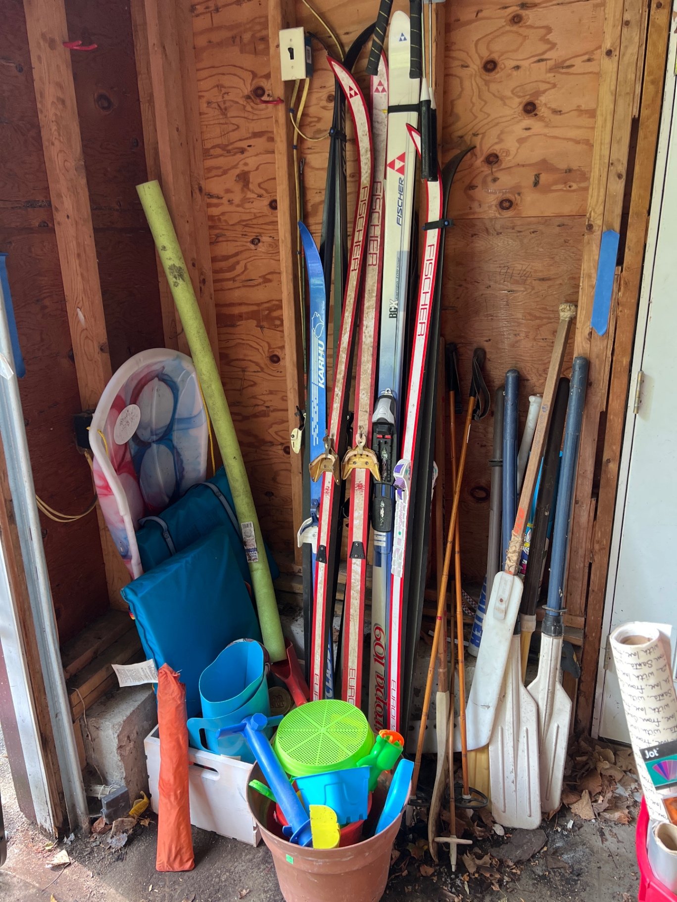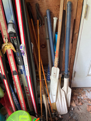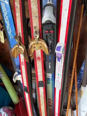 A collection of snow skis with bindings and ski poles, plus plastic gardening toys, buckets, shovels, and other sporting equipment. Snow sleds. Some equipment is vintage including bamboo ski poles Located in garage.