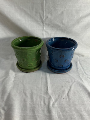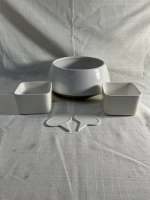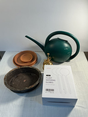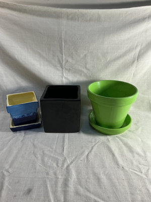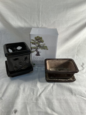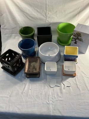 A collection of ceramic pots in various colors (green, blue, black, white), different shapes (cylindrical, square, bowl-shaped), a Bonsai Trio Kit box, plant watering globes and all you see here.