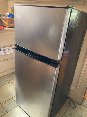 A stainless steel Insignia two-door refrigerator with a top freezer and a white interior. The interior features two shelves and crisper drawer. Working at time of cataloging.