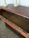 A small wooden bureau with several drawers and a decorative hand-painted floral motif on the front. Approx 32x42"