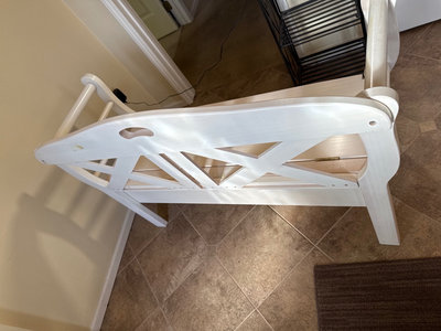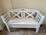 A Shabby chic white wooden storage bench with hinged lift-top seat revealing an interior storage compartment; features a back with X-shaped cross supports and curved armrests. It is 4' wide, by 17" deep, seat is 17" high and 30" high in back.